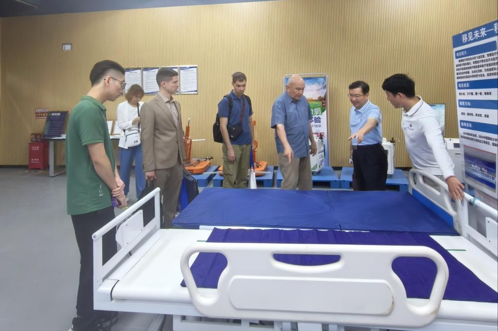 在多功能医疗转移床展示区,一款功能强大的转移床吸引了教授们的目光。这款多功能医疗转移床不仅具备上下伸缩、左右倾斜等基本功能,还能够实现病人的传送与转移,极大地节省了人力。Rostem Sabitov教授在观看多功能移位床演示之后,对转移床的设计给予了高度评价,并提出了宝贵的建议,他提到,可以将床的材料改为较为轻柔的塑胶材料,而床体的支撑材料可以采用支撑性较好的金属钢体材料。