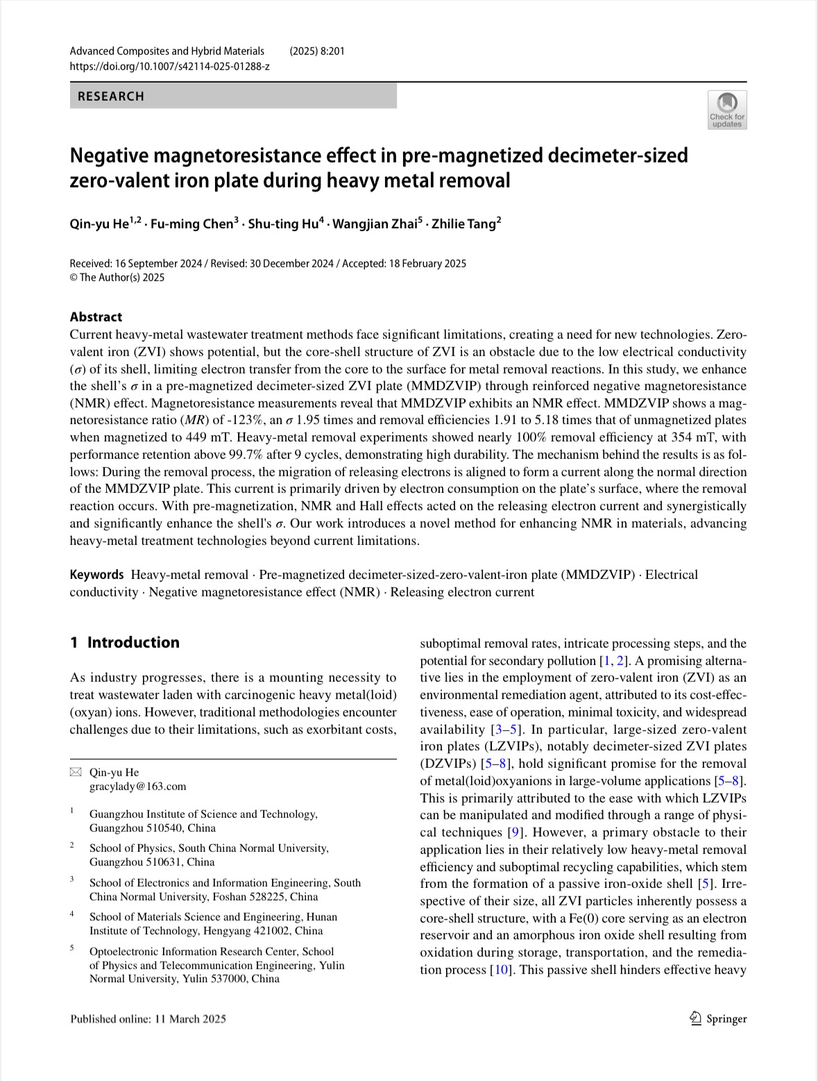 (李树良)3月11日,我校何琴玉教授团队以第一作者在复合物功能与器件领域影响因子最高的工程类期刊《Advanced Composites and Hybrid Materials》(2023年影响因子IF:23.2)上发表题为“Negative magnetoresistance effect inpre-magnetized decimeter-sized zero-valent iron plate duringheavy metal removal”的研究论文。广州理工学院为论文第一署名单位,何琴玉教授这篇论文是该期刊最新一期首篇论文。