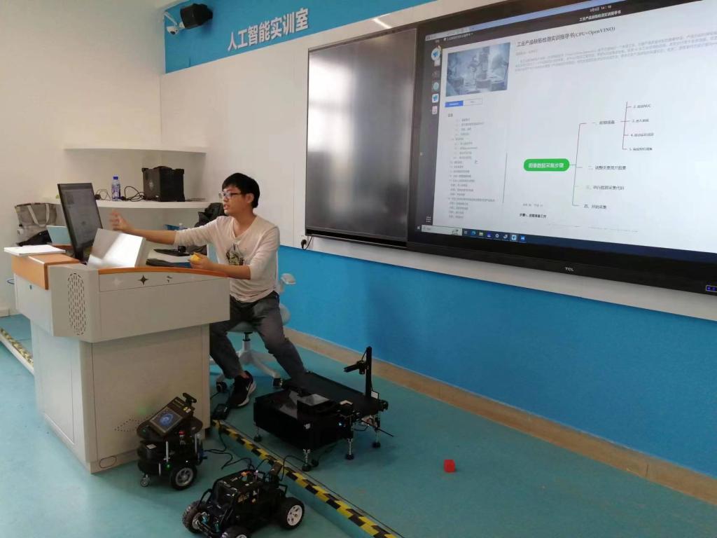 此次培训围绕自主巡航小车、机器视觉识别、Baidu AI Studio课程平台大搭建与使用等多个内容讲解,主讲工程师重点对设备结构、操作、程序控制等进行了介绍。培训中,老师们积极参与,主动沟通与交流。
