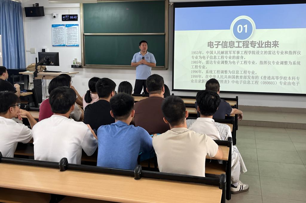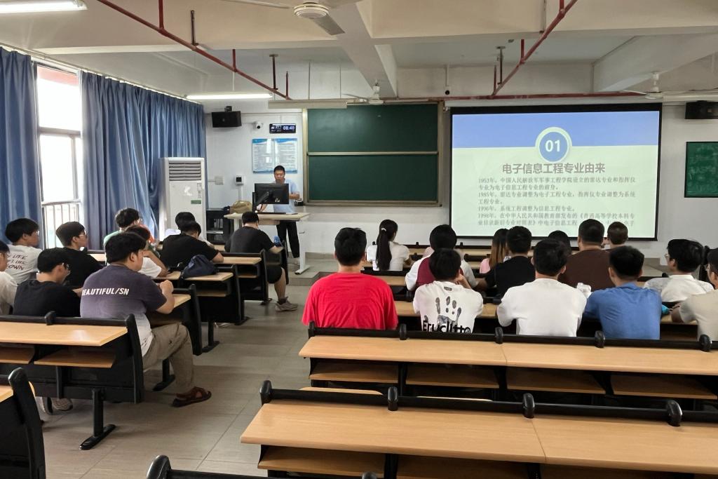 电子信息工程专业底蕴深厚,其前身可追溯至1953年中国人民解放军军事工程学院设立的雷达与指挥仪专业。历经多年发展,于2001年正式成立,如今已成为省级应用型人才培养示范专业和校级一流专业。同学们在聆听专业发展历程时神情专注,对电子信息工程深厚的学科背景与清晰的发展路径表现出极大兴趣。专业教师队伍结构合理、业务精湛,现有专任教师22人,高级职称占比41%,全部教师拥有硕士及以上学位。教师们不仅教学经验丰富,更积极开展科研,为学生提供优质的学习与实践平台。同学们在了解师资力量时认真聆听,对未来的学术引导和实践机会充满期待。在介绍培养目标时,学生们仔细聆听,积极思考。专业强调培养具有良好人文素养、创新能力以及跨学科整合能力的高素质应用型人才,毕业生可在电子信息系统、嵌入式开发、智能信息处理等领域从事技术与管理等工作。这一目标引发了同学们的广泛共鸣。专业核心课程如《电路分析基础》《模拟电子技术》《C语言程序设计》《FPGA开发与应用》等构建了扎实的课程体系。同学们在听到课程介绍时纷纷记录要点,表现出对后续学习的明确规划。在建议环节,专业鼓励大家积极参与项目工作室、学科竞赛、科研论文、专利申请、文体活动及继续深造等多元发展路径。许多学生认真听取建议,眼神中透露出对大学生活的憧憬与计划。面对“如何应对课程困难”“怎样规划人生”“本科阶段应收获什么”等问题,同学们反应积极,认真思考,展现了良好的心态和发展潜力。