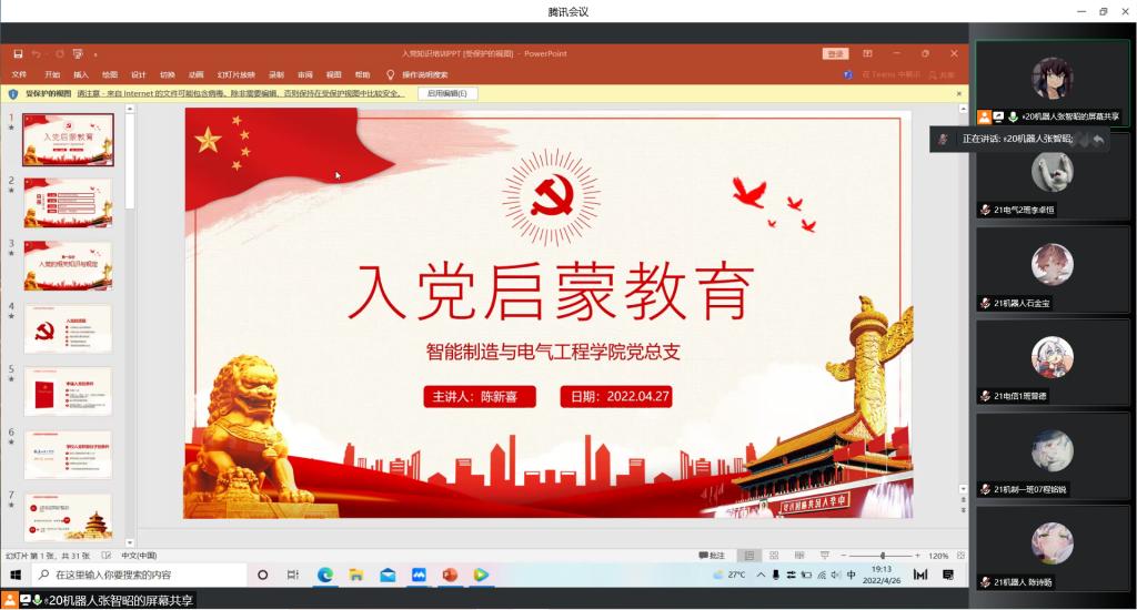 4月26日晚,为加强全院学生对中国共产党的认识,提高思想觉悟,端正入党动机,积极向党组织靠拢,根据学校三全素质活动周的工作要求和学院党总支的党建引领安排,我院党总支通过线上腾讯会议的形式,对全院所有在校学生进行入党基本知识培训。五场线上会议分别由学生党支部支委潘展鸿、苏国辉、黄炅杲、苏国辉、张智昭主持。