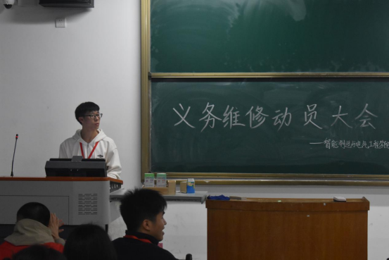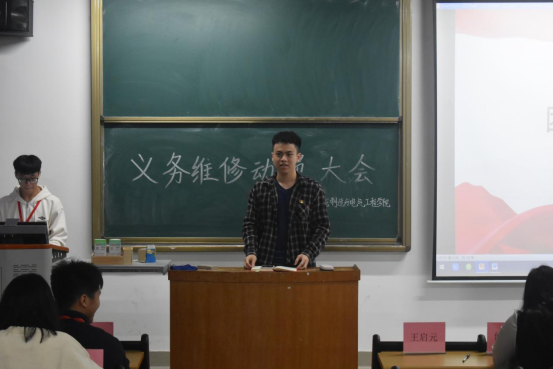 学生会主席团成员陈嘉鸿同学表示,党员义务维修活动是展现组织部门人员协调配合的有利契机,希望大家发扬雷锋精神,积极为我校师生提供服务。党务工作组代表王启元同学讲到,各位同学作为智电学院的一份子,更应结合自身专业、个人能力,学以致用,希望大家能够做积极参与其中,在活动中热心帮助他人。学院党总支组织员谢燕惠、团总支书记李顺重点强调了安全问题,提醒同学们在进行义务维修时应注意用电安全,同时向大家宣传日常安全用电方法。