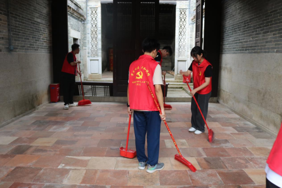 走访过后,社会实践队决定为旭日古村乡村振兴贡献自己的青春力量。在村委领取了扫帚和簸箕等工具后,对旭日古村的村道、陈百万故居进行清洁卫生打扫。队员们认真细致,不怕苦不怕累,干劲十足,助力乡村人居环境美化改善。