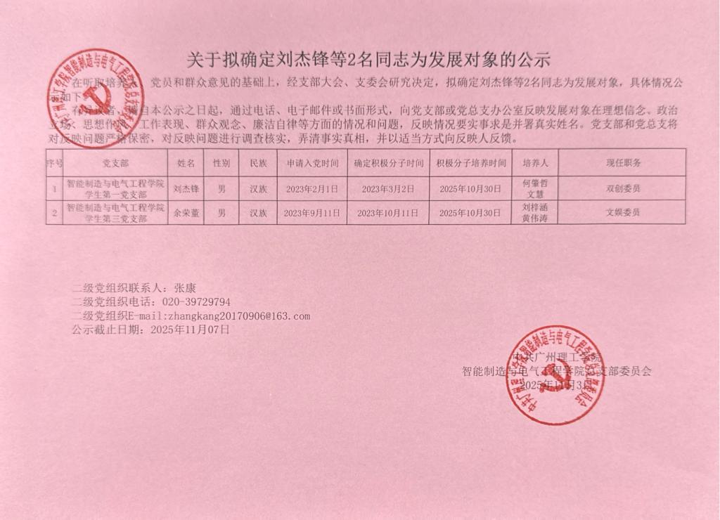 在听取培养人、党员和群众意见的基础上,经支部大会、支委会研究决定,拟确定刘杰锋等2名同志为发展对象,具体情况公示如下。