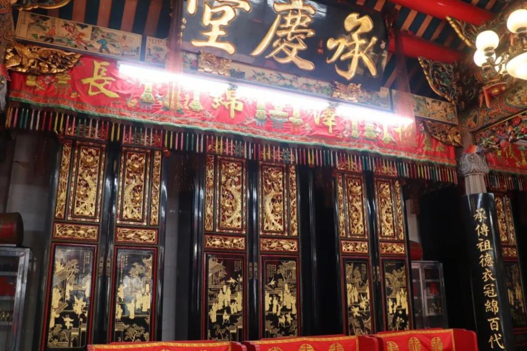 在祠堂正中,师傅亲自为我们打开神位的柜门,介绍神位的设置与摆放讲究。这些神位不仅承载着家族敬祖祭祀的传统,也是潮汕人尊祖重亲、慎终追远文化观念的体现。神位的雕刻装饰严谨、对称,展现了潮阳木雕在宗族场所中的重要地位。