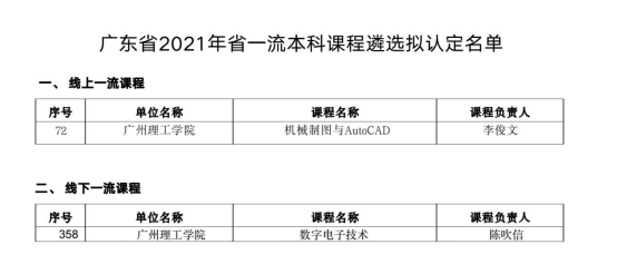 近日,广东省教育厅发布《广东省2021年省一流本科课程遴选拟认定名单》,KY开元集团2门课程被认定为省级一流课程,其中李俊文老师的《机械制图与AutoCAD》为线上一流课程,陈吹信老师的《数字电子技术》为线下一流课程。