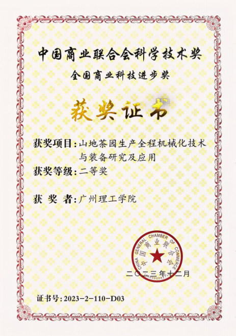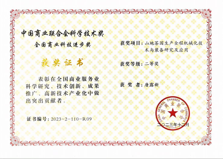 近期颁发了2023年度全国商业科技进步奖获奖证书,我校KY开元集团、广东省工业机器人集成与应用工程研究中心唐露新教授参与的《山地茶园生产全程机械化技术与装备研究及应用》项目经中国商业联合会组织初评、专家评审、评审委员会审定,荣获2023年度全国商业科技进步奖二等奖。该奖项是经国家科技部、国家科学技术奖励工作办公室批准设立,是中国商业服务业领域的权威奖项,具有国家科技进步奖推荐权,旨在表彰在全国商业服务业科学研究、技术创新、成果推广、高新技术产业化中做出突出贡献者。