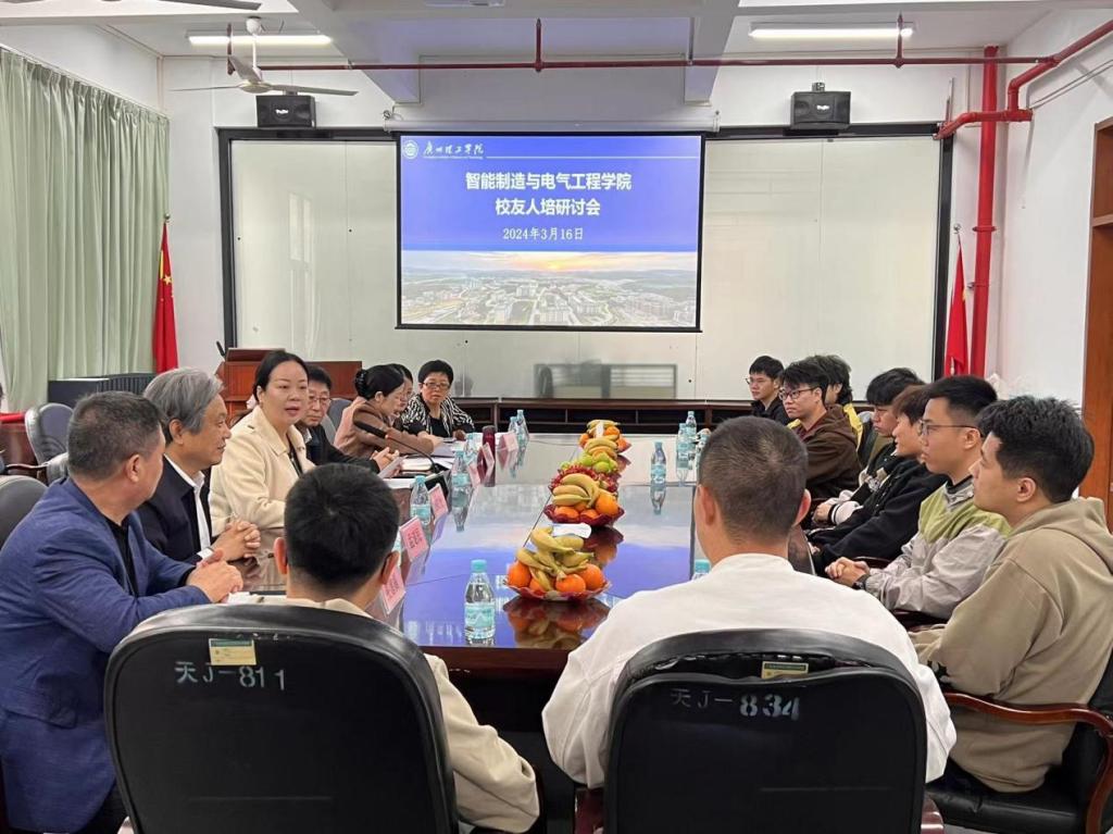 参会人员包括智电学院院长李玉忠、副院长朱亚峰、副院长孟遂民、党总支副书记吕在艳、电气工程系主任郭贵莲、智能制造系主任王如意、机器人系主任张德福、教务秘书胡婉莹,以及14位优秀毕业校友。