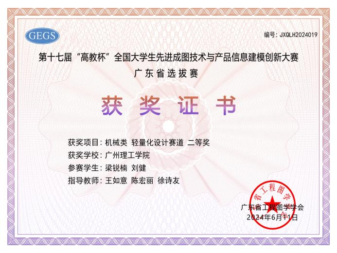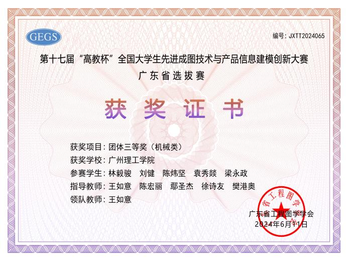 5月25日,在第十七届大学生先进成图技术与产品信息建模创新大赛机械类广东省选拔赛(线上)中,我校智电学院教师王如意、陈宏丽、鄢圣杰、徐诗友、樊港奥带领20位不同专业学子参加本次大赛。经过初赛的激烈角逐,我校获得省赛团体三等奖。刘健、林毅俊、陈炜坚、袁秀燚、梁永政、林紫敏、苏健滨、杨乾熙、徐世强、吕立濠同学在先进成图技术机械赛道中分别荣获省级三等奖。此外,在5月12—13日进行的轻量化设计赛道中,刘健和梁锐楠两位同学荣获省级二等奖。
