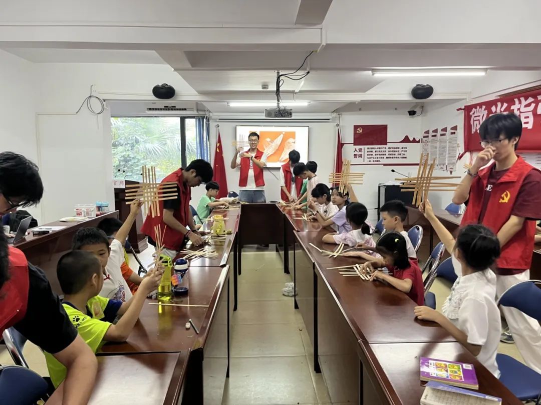 在日常的课业辅导环节,实践团成员们耐心地为学生们解答学习中遇到的难题,帮助他们巩固知识、查漏补缺,让每个孩子都能得到充分的关注和指导,有效提高了学习效率。而在下午举办的创意手工非遗竹编课程上,孩子们与实践团成员都兴趣满满。主讲人22电信1班谭诺贤与实践团成员们手把手地传授竹编技艺,让青少年们亲身感受到了传统文化的魅力。一根根竹子在孩子们的手中变成了精美的竹编小船,他们在创作中收获了乐趣和成就感。