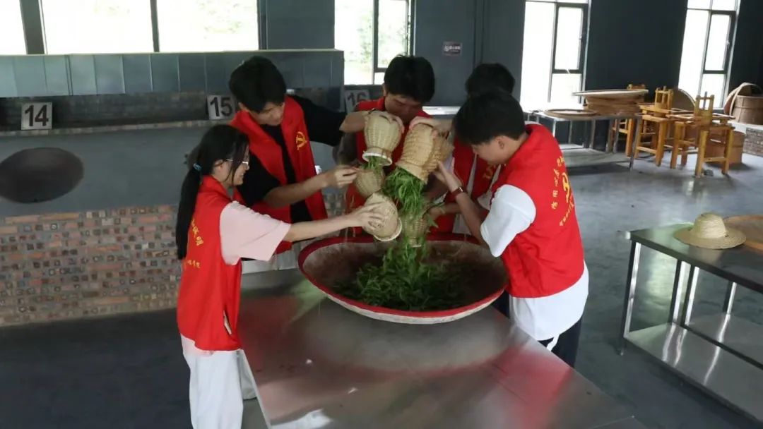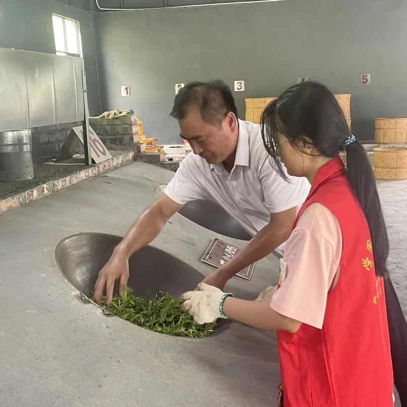 炒青完成后,茶叶进入揉捻阶段。揉捻是使茶叶揉卷成条、破坏叶细胞、挤出茶汁、黏附于叶表、增加茶叶浓度的重要步骤。我们站在一旁,观察厂长如何运用双手的力量,将茶叶揉成紧致的条状。随后,我们也纷纷尝试,虽然手法略显生疏,但每一次的按压与翻转都凝聚了我们对茶叶的期待。在揉捻的过程中,茶叶逐渐变得柔软而有弹性,散发出香气。在这个过程中,我们感受到了茶叶从松散到紧致的奇妙变化。