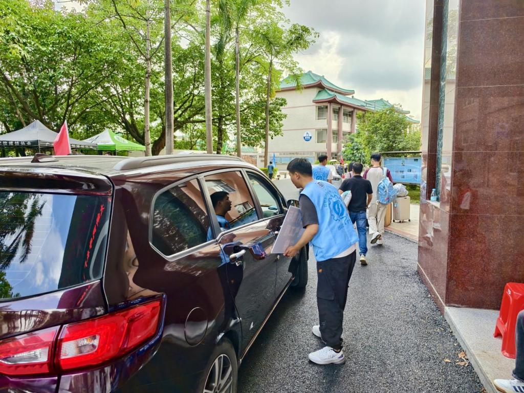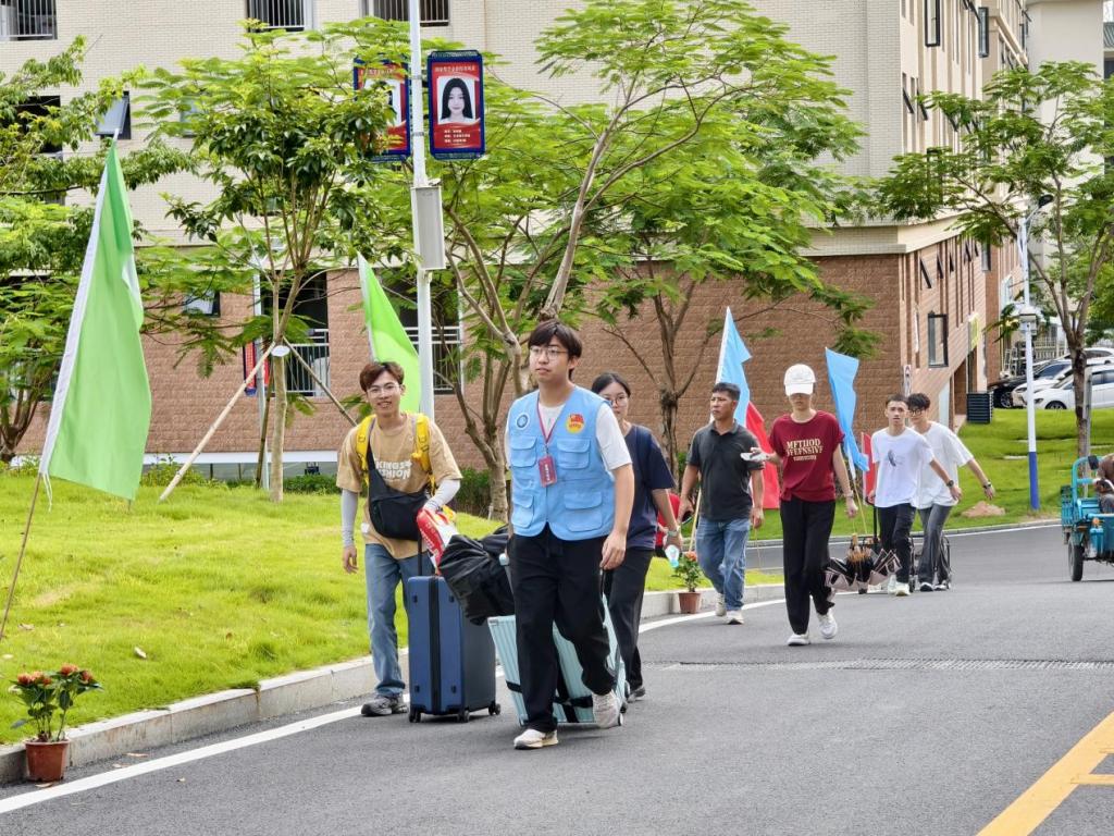 人群中,志愿者们积极协助,无论是沉重的行李箱,还是琐碎的生活用品,都被安全稳妥地送达宿舍。他们热情介绍校园环境、分享生活贴士。学校及学院领导也亲临报到现场,仔细询问工作进展与志愿服务情况,并与学生亲切交流,倾听需求、解答困惑。