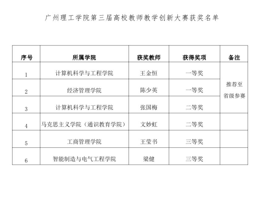 3月2日,广州理工学院教务处公布了广州理工学院第三届高校教师教学创新大赛获奖名单。经评审,本次比赛共评选出6位获奖者,其中我院梁健老师荣获校赛三等奖。