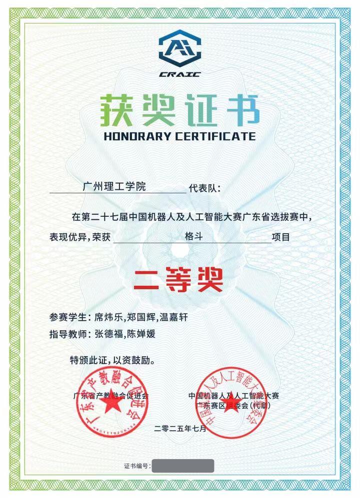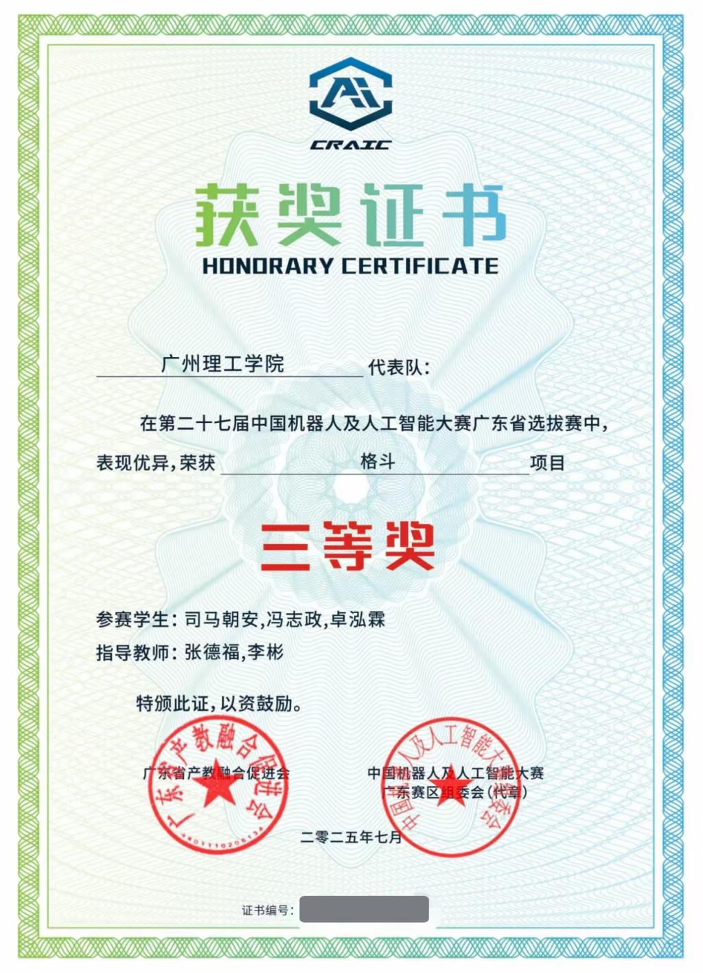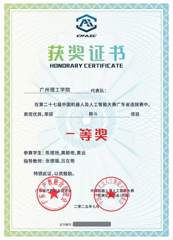 第二十七届中国机器人及人工智能大赛广东省选拔赛成绩揭晓,我校学子表现优异,在格斗赛项目中斩获佳绩。其中,由我校张德福,吕在艳,陈婵媛,李彬老师指导的陈煜杨同学,黄远同学,龚颖皓同学荣获省赛一等奖,席炜乐同学,郑国辉同学,温嘉轩同学荣获省赛二等奖,司马朝安同学,卓泓霖同学,冯志政同学荣获省赛三等奖,展现了我校在人工智能及机器人领域人才培养方面的突出成果。