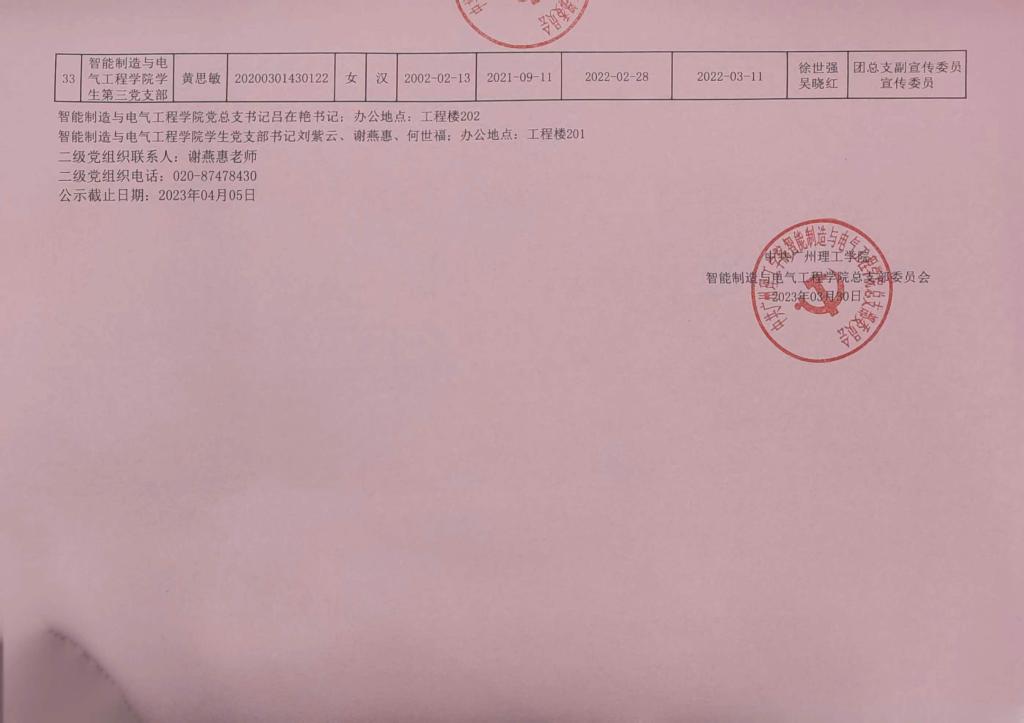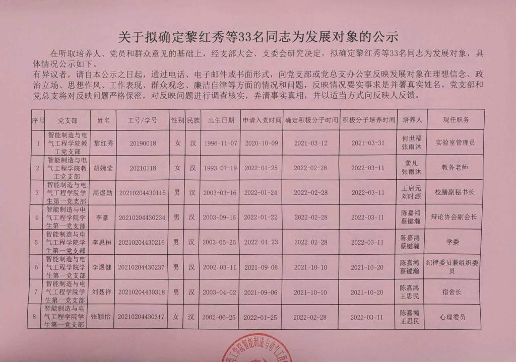 在听取培养联系人,党员和群众意见的基础上,经支部大会,支委会研究决定,拟确定黎红秀等33名同志为发展对象,具体情况公示如下。