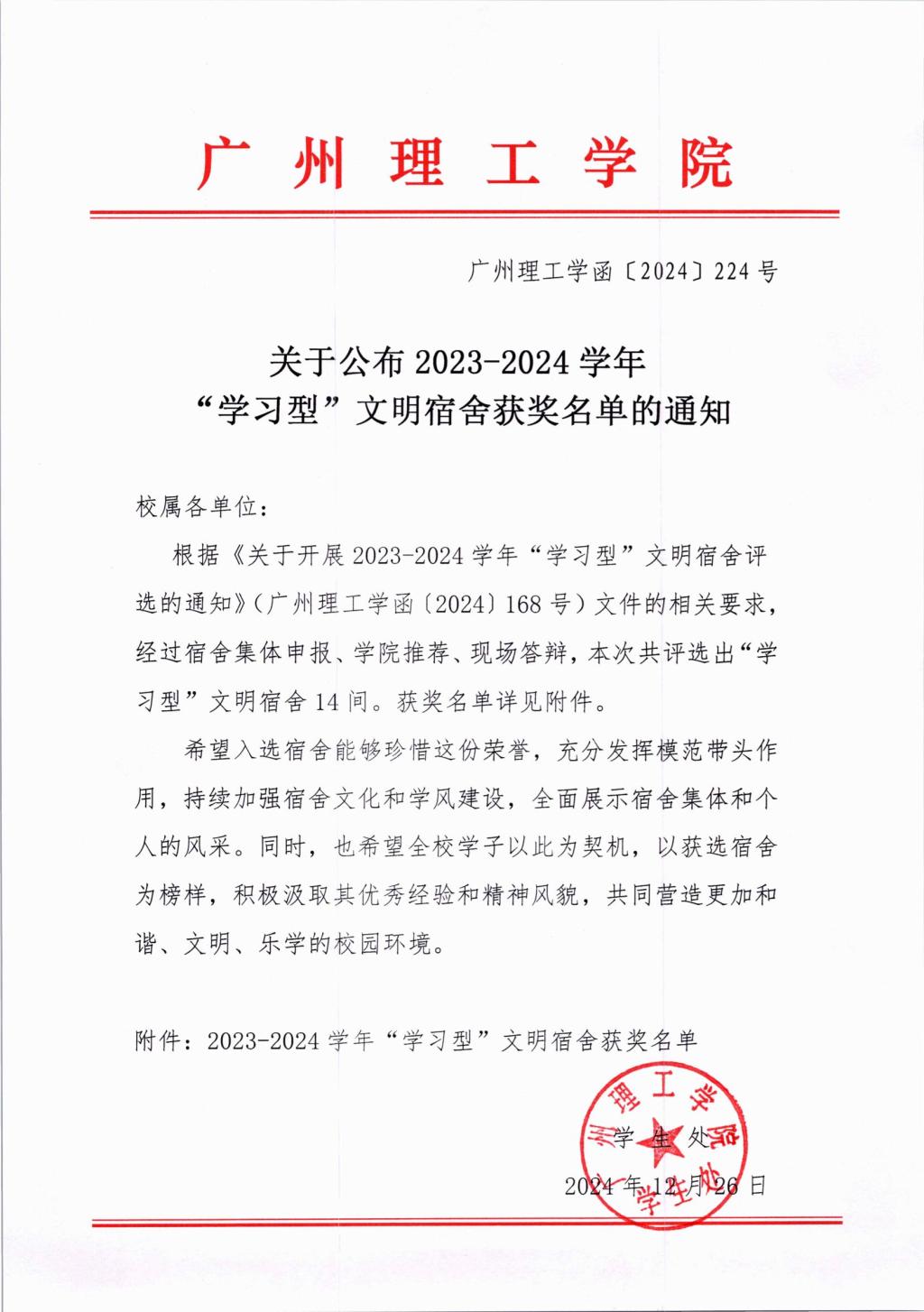 关于公布2023-2024学年“学习型”文明宿舍获奖名单的通知