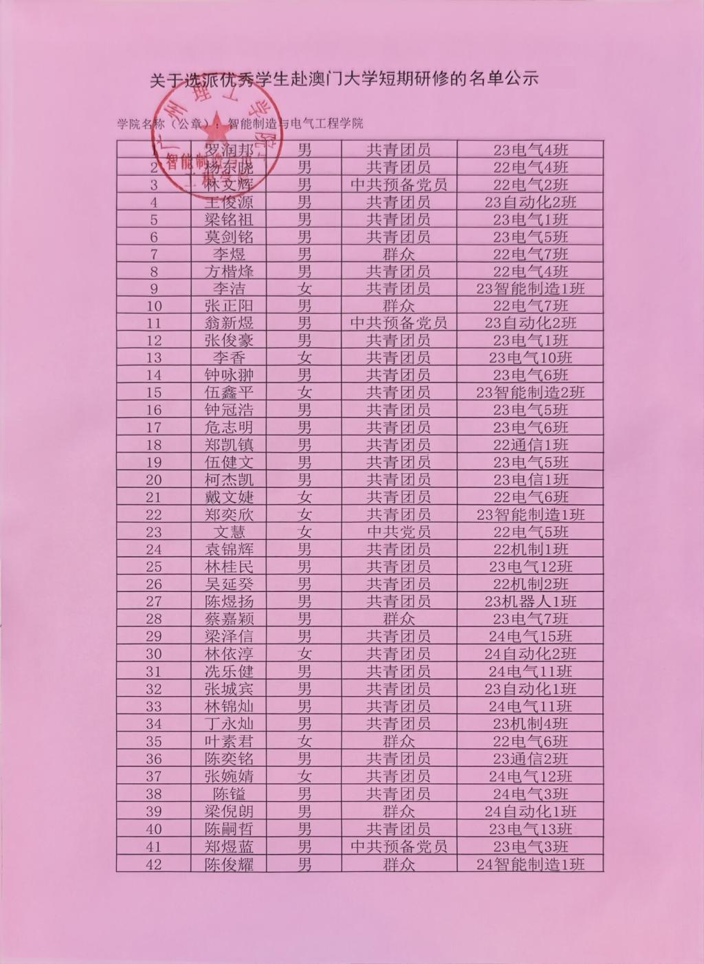 根据广州理工学院《关于选派优秀学生赴澳门大学短期研修的通知》有关要求,我院组织申报,由教师、学生本人提出申请、二级学院严格审核个人提交申报材料,现将评选结果公示如下: