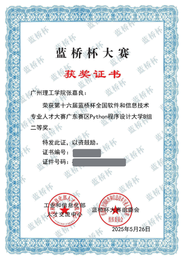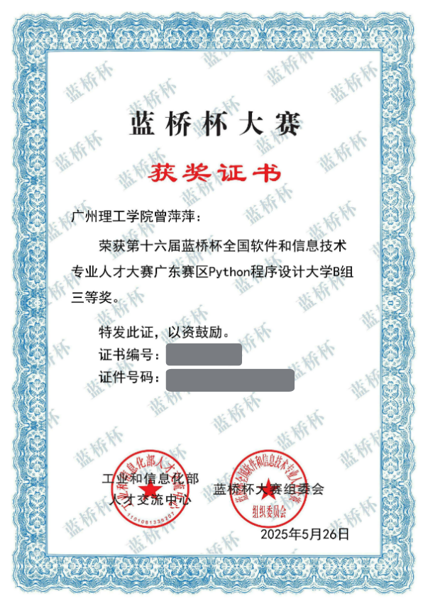 第十六届蓝桥杯全国软件和信息技术专业人才大赛广东省赛成绩揭晓,我校学子表现优异,在Python程序设计竞赛中斩获佳绩。其中,由我校KY开元集团朱亚峰、贾林锋老师指导的张嘉良同学荣获省赛二等奖,曾萍萍同学获得省赛三等奖,展现了我校在信息技术人才培养方面的突出成果。
