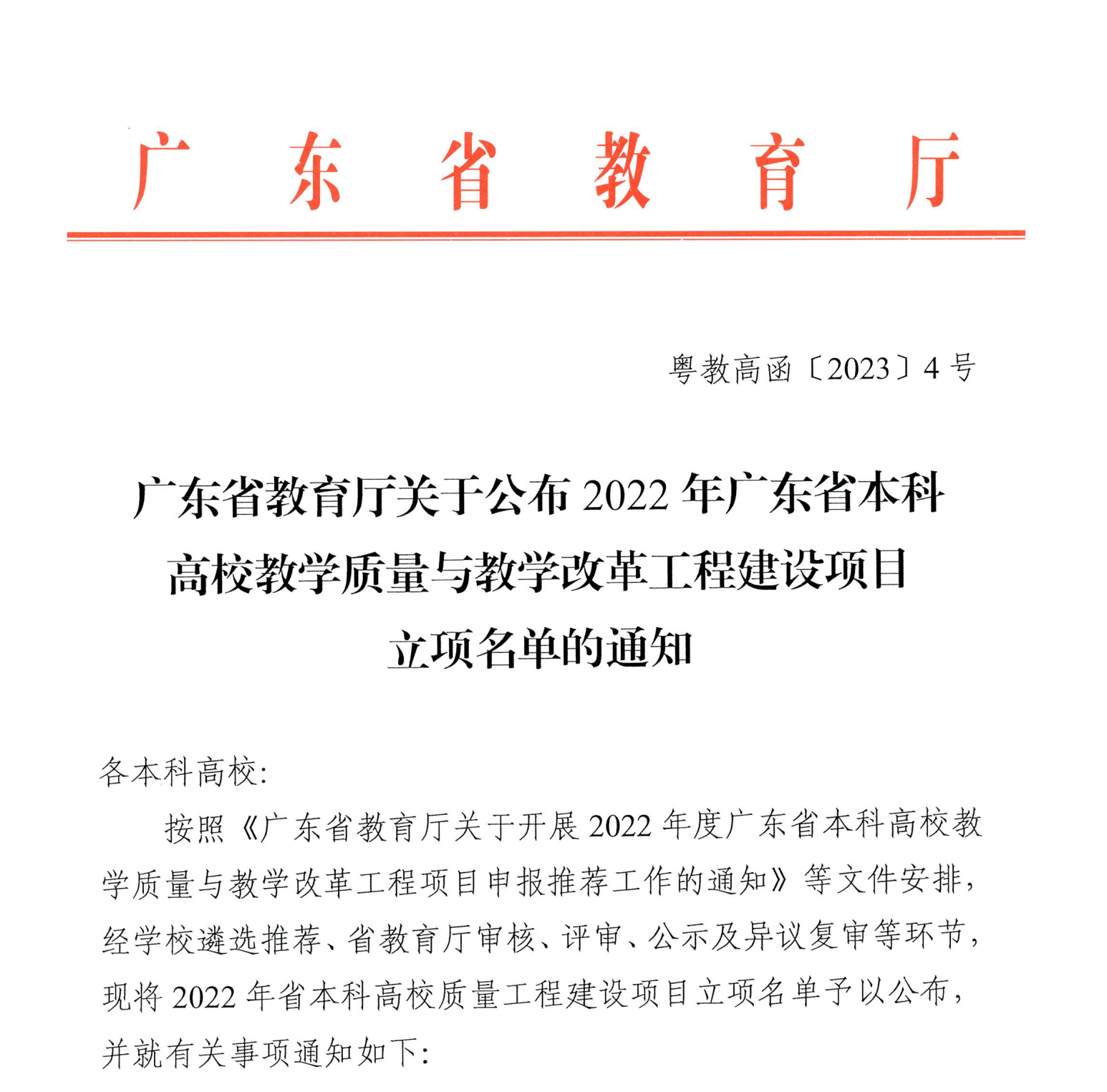 近日,广东省教育厅公布了2022年广东省本科高校教学质量与教学改革工程建设项目立项名单(粤教高函〔2023〕4号),KY开元集团申报的2个项目均获立项,成绩喜人。