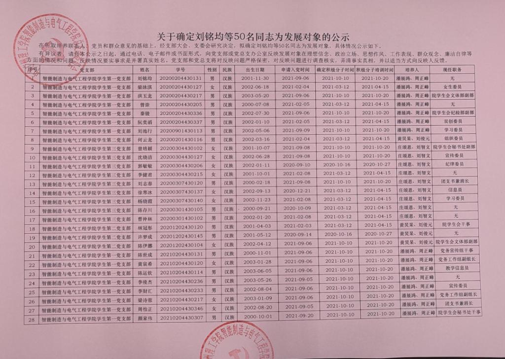 在听取培养联系人,党员和群众意见的基础上,经支部大会,支委会研究决定,拟确定刘铭均等50位同志成为发展对象,具体情况公示如下。