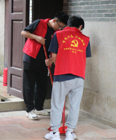 走访过后,社会实践队决定为旭日古村乡村振兴贡献自己的青春力量。在村委领取了扫帚和簸箕等工具后,对旭日古村的村道、陈百万故居进行清洁卫生打扫。队员们认真细致,不怕苦不怕累,干劲十足,助力乡村人居环境美化改善。