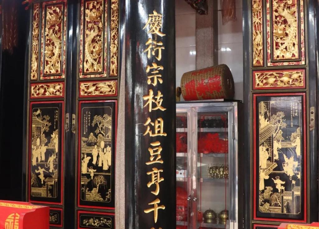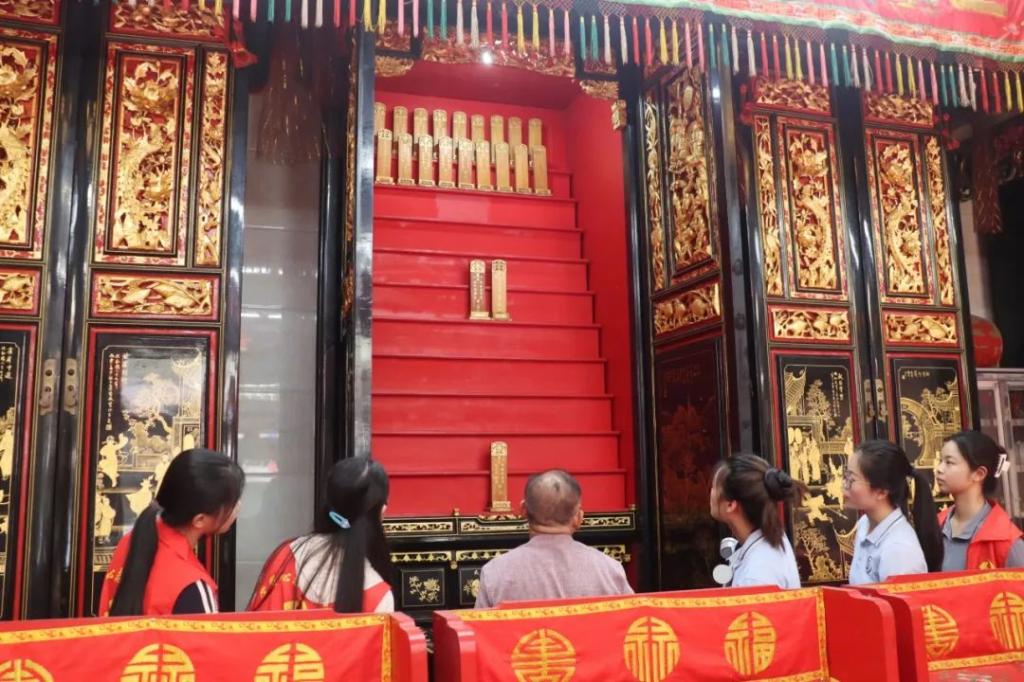 在祠堂正中,师傅亲自为我们打开神位的柜门,介绍神位的设置与摆放讲究。这些神位不仅承载着家族敬祖祭祀的传统,也是潮汕人尊祖重亲、慎终追远文化观念的体现。神位的雕刻装饰严谨、对称,展现了潮阳木雕在宗族场所中的重要地位。