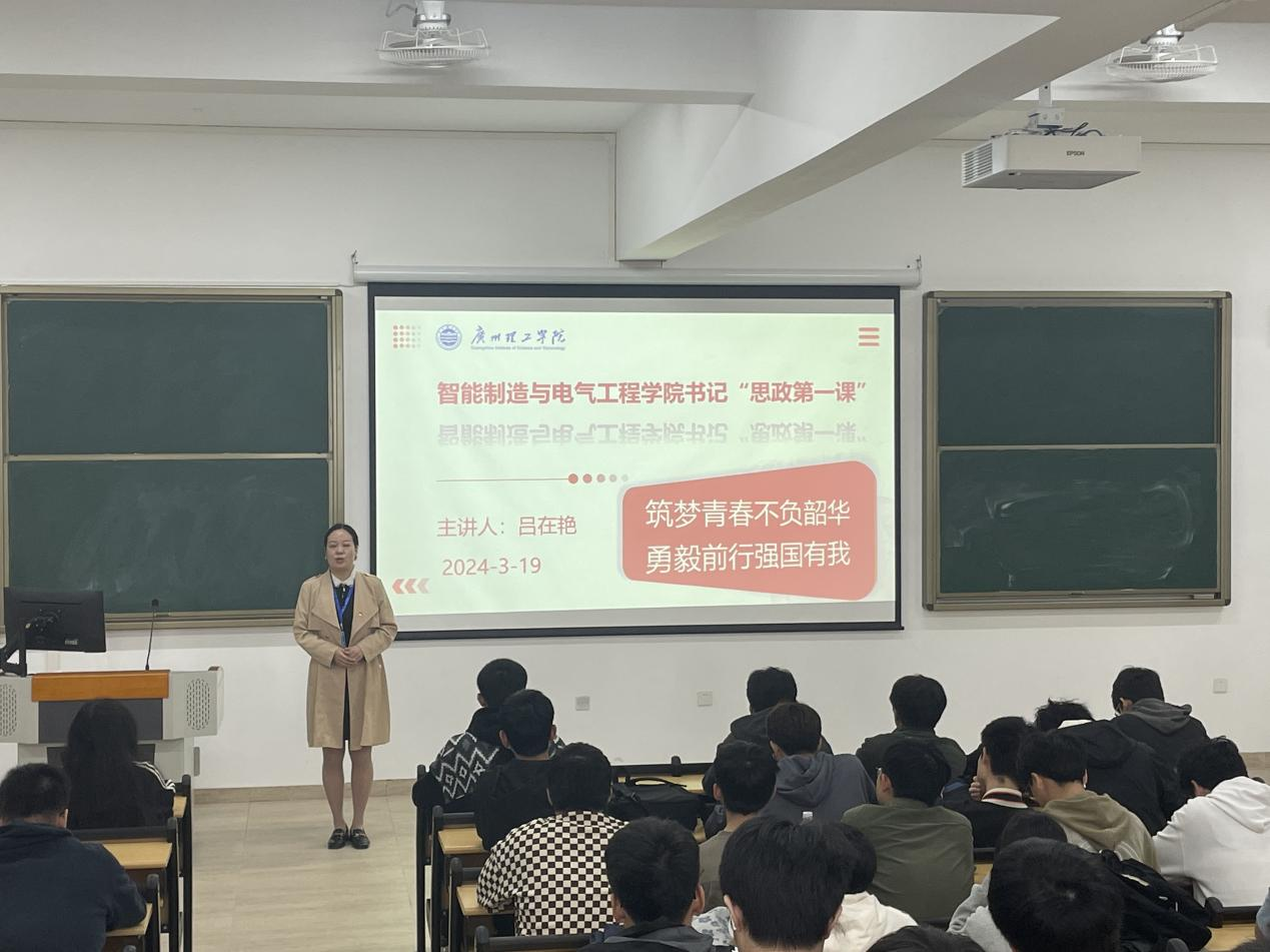 3月19日上午,学院党总支书记吕在艳以《筑梦青春不负韶华,勇毅前行强国有我》为主题,在惠州校区1栋教学楼211教室给2023级的153名学生代表带来了一堂生动的“思政第一课”。