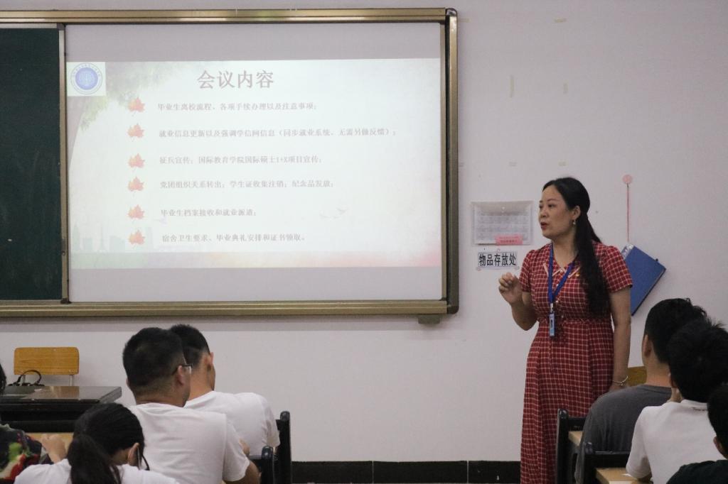 会上,辅导员为毕业生详细普及离校流程、各项手续办理的注意事项、就业信息和学信网信息更新,同时针对基层就业和应征入伍的相关政策做解读;就团党关系转出做了说明,并且收集学生证进行注销和发放纪念品。