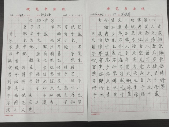 本次硬笔书法大赛指定内容《古今贤文˙劝学篇》(一)、《古今贤文˙劝学篇》(二)、《劝学》,同学们可任选一篇进行书写。同学们态度谦逊,认真谨慎,一笔一划尽显对书法的热爱。比赛结束后,一些优秀的作品被张贴在展板上进行展示,让更多的学生感受书法的魅力。这些作品或行云流水,尽显磅礴之气;或端正工整,秀气内敛,凸显文雅之风,它们通过不同的形式、不同的书体营造了百花齐放、异彩纷呈的效果。