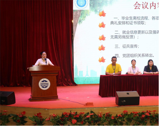 辅导员石玲和李顺老师向同学们具体介绍了党团关系转移、户口迁移、毕业证书发放等各项离校手续办理的流程。之后,院党总支书记吕在艳结合当前就业形势,向毕业生提出三点期许。一是鼓励毕业生积极行动,通过各种渠道途径主动获取更多招聘信息,积极参加招聘会,珍惜应聘机会,积累面试经验,在实战中提升就业竞争力。二是希望毕业生们制定求职策略,就业选择是多元的,而不是唯一的,制定适合自己的求职策略,有助于提高就业成功率。三是希望毕业生们感到就业迷茫时、需要帮助时,记得与辅导员老师联系,老师们会为毕业生们提供支持和服务。