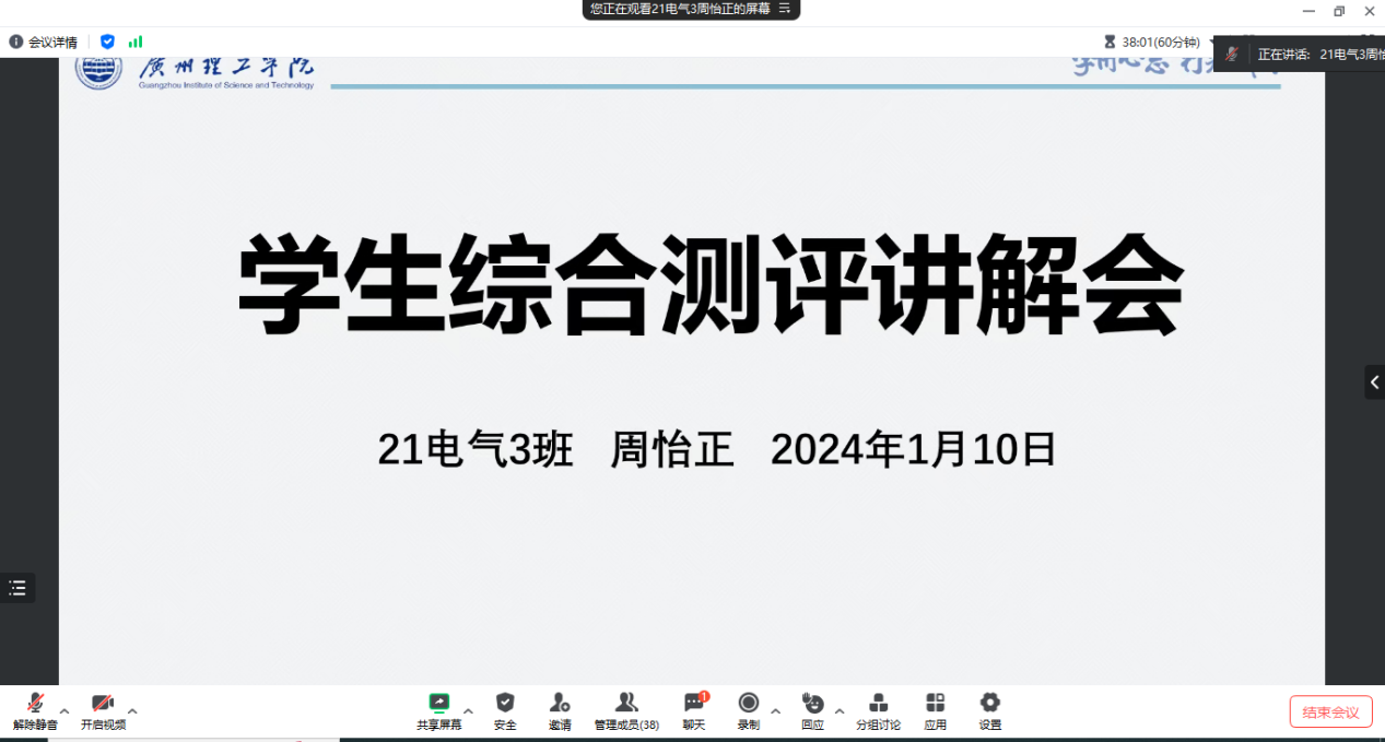 为进一步落实《学生综合测评实施办法》相关要求,指导23级学生顺利开展学生综合测评工作,1月10日,智电学院召开了2023级综合测评线上讲解会。本次会议由辅导员老师谢燕惠主持,邀请了20电气1班王思民同学及21电气3班周怡正同学为23级各班班长、学习委员等学生干部讲解综测工作开展具体细则及实施方法。