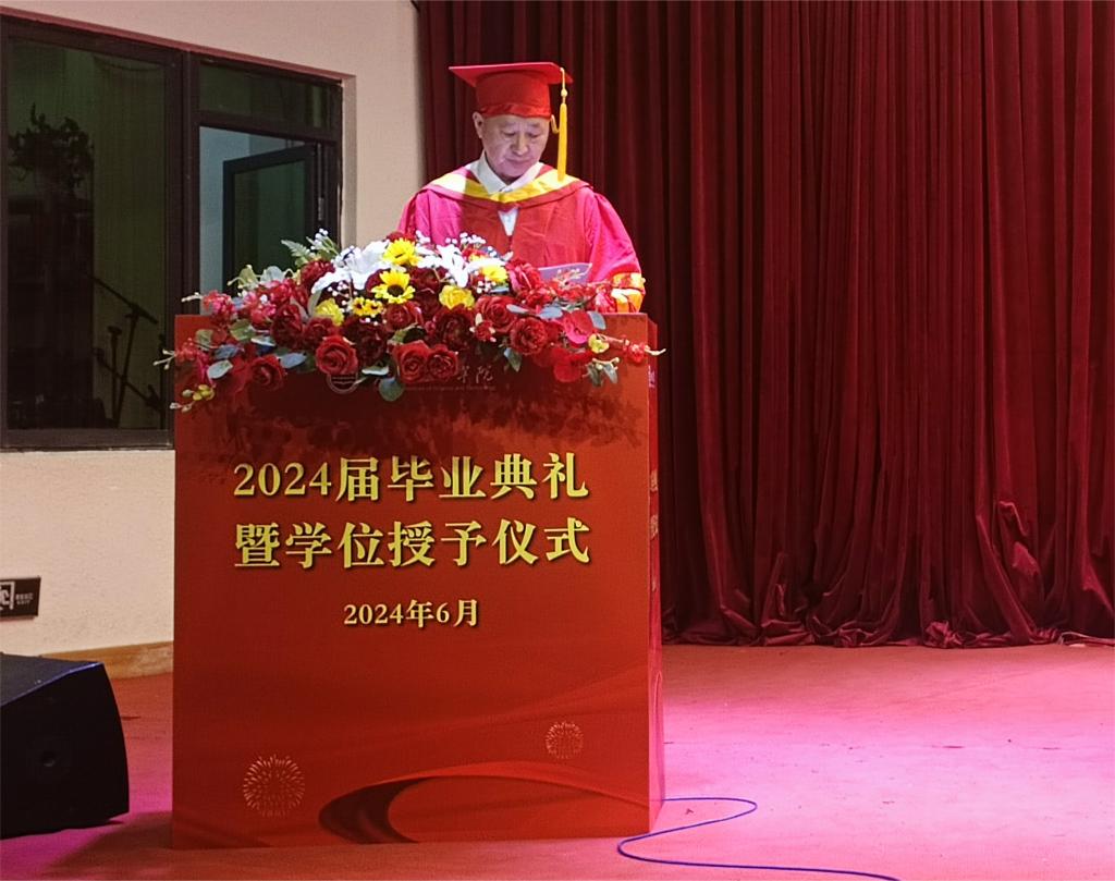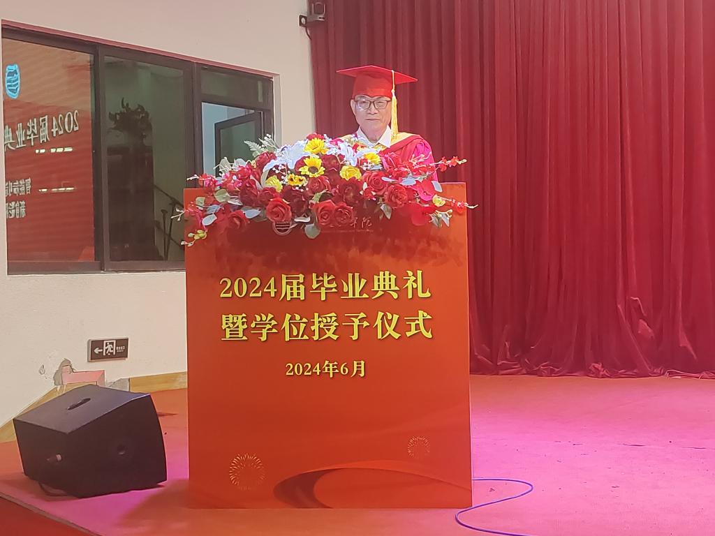 新能源汽车工程学院院长简弃非教授致辞,建议同学们要敬业专业精业,就是用敬畏、敬重的态度对待自己的工作,认真负责、一心一意、精益求精。要养成良好习惯,好的习惯,让大家的生活不再凌乱,内心不再空虚。要终身学习,世界不断变化,科技、社会、经济都在不断进步。终身学习可以帮助同学们跟上这些变化,适应新的情况,保持竞争力。无论是工作上的新技术还是社会变革,学习都是应对变化的最佳途径。从今天起,同学们的身份将从广州理工学院的学生转变为广州理工学院的校友。未来的日子里,广州理工学院的故事,将在同学们创新奉献的奋斗中书写;广州理工学院的荣光,将在同学担当的捷报中闪耀。他提出,同学们永远是母校的牵挂,母校永远是大家温暖的港湾,希望同学们常回家看看。
