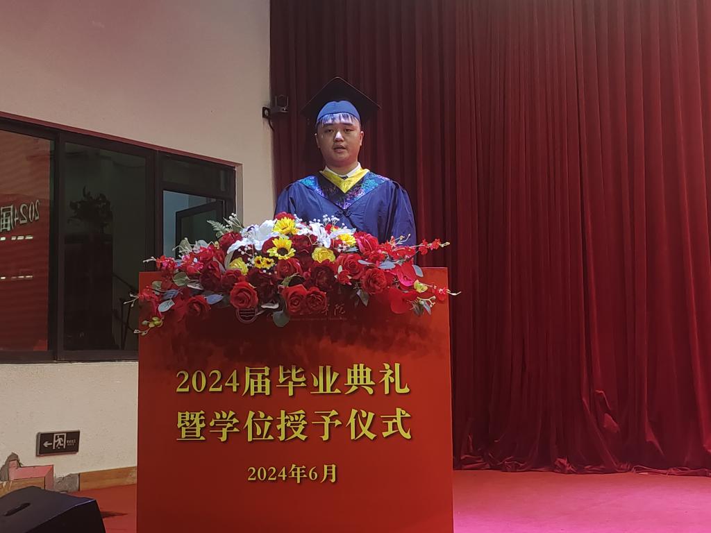 智电学院执行院长李玉忠教授致辞,向全体毕业生送上临别寄语和真挚祝福。李院长细数2024届毕业生四年大学生涯及取得的骄人成绩。为即将走出校门,走向社会的同学们提出三点希望,一是要把握国家大势,踏准国家发展的韵律,与国家的步调一致,才能实现人生目标的最大化。二是要学习,永远在路上,不学习无法跟上时代的步伐,希望大家关注人工智能和本专业的发展进步,只有不断学习新知识、新理论、新思想、新技术,才能有自己的创新,才能有工作成就,才能有美好的未来。三是要踏实做事。人生其实是没有多少捷径的,看别人成功好像是偶然,走到了捷径,其实都是一步一个脚印努力付出的结果。事实上,每个成功背后都是努力的汗水浇铸出的结果。他勉励同学们,南粤大地是国家与世界竞争高端制造业的一片热土,一片天空,一片海洋。李玉忠院长深情嘱咐毕业生:“虽然你们即将离开校园,但这里有你们奋斗的青春记忆,是你们梦想起航的地方,无论你们走到哪里,广州理工智电学院永远是你们最温暖的家!母校的大门永远为你敞开,欢迎大家常回家看看!”