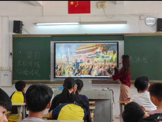 接着,由庄妙慧与黄菊同学为小朋友们介绍了中国近代美术的发展并带领大家欣赏中国近代史上的经典美术作品,小朋友们被一幅幅充满时代感的国画所吸引。黄菊同学讲解了作品的创作背景、艺术风格及技法特点,让小朋友们深刻体会到中国传统绘画在近代的变革与发展。同时,也让小朋友们了解到这些作品如何反映了当时社会的风貌与人民的精神追求。