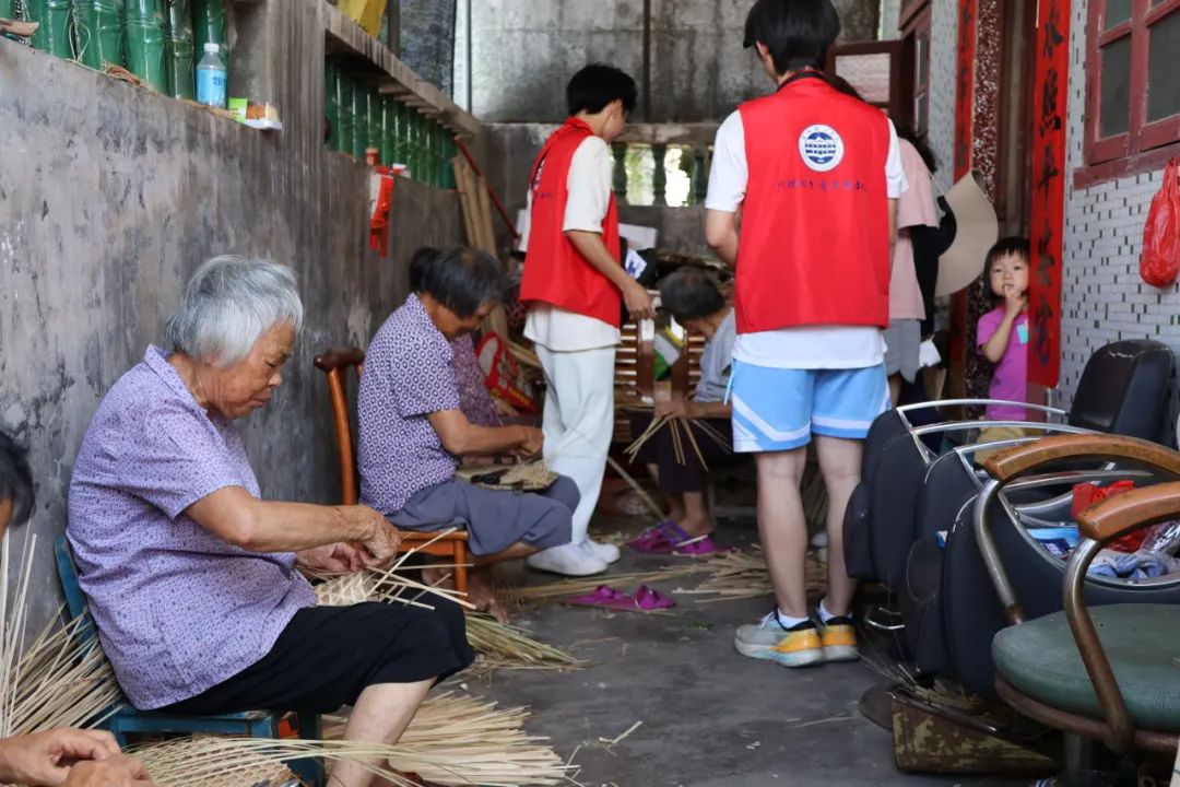 夏日炎炎,阿嬷们三两成群地聚在屋檐下编织竹篮,闲聊的同时十指翻飞,手上编织竹篾的速度丝毫不减。见到队员们来寻访时也是热情的把大家迎进屋内,为我们介绍正在编织的手工艺品。屋内是阿嬷们已经编制好的竹篓、灯笼、杯套等制品。据一位阿嬷介绍,编织洋篮的步骤繁多,从一根青翠的竹子加工成一条薄薄的篾片,再经过编织做成洋篮,往往经历数十个步骤,耗费大量的精力,但是做出来的洋篮收购价格又不高,因此现在洋篮的制作工艺已经出现严重的断层,已经很少有年轻人去学习这项技艺了。