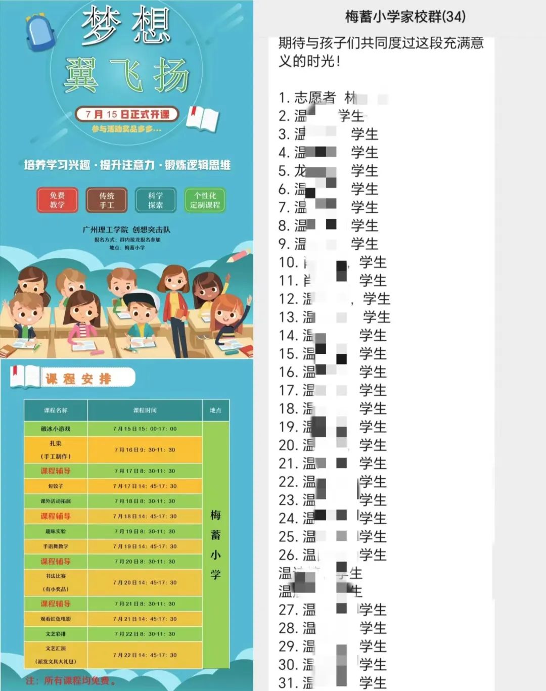 在支教活动报名海报发出后,家长们纷纷参与报名,截至7月15日中午12:00,累计报名人数突破40人,这远远多于梅蓄小学全体在校人数,切实展现了小朋友们参与活动的热情和积极性,反映了家长对实践团队的充分信任。活动开始前,实践团早早抵达教室,精心准备,为与小朋友们的初次见面营造良好的氛围。