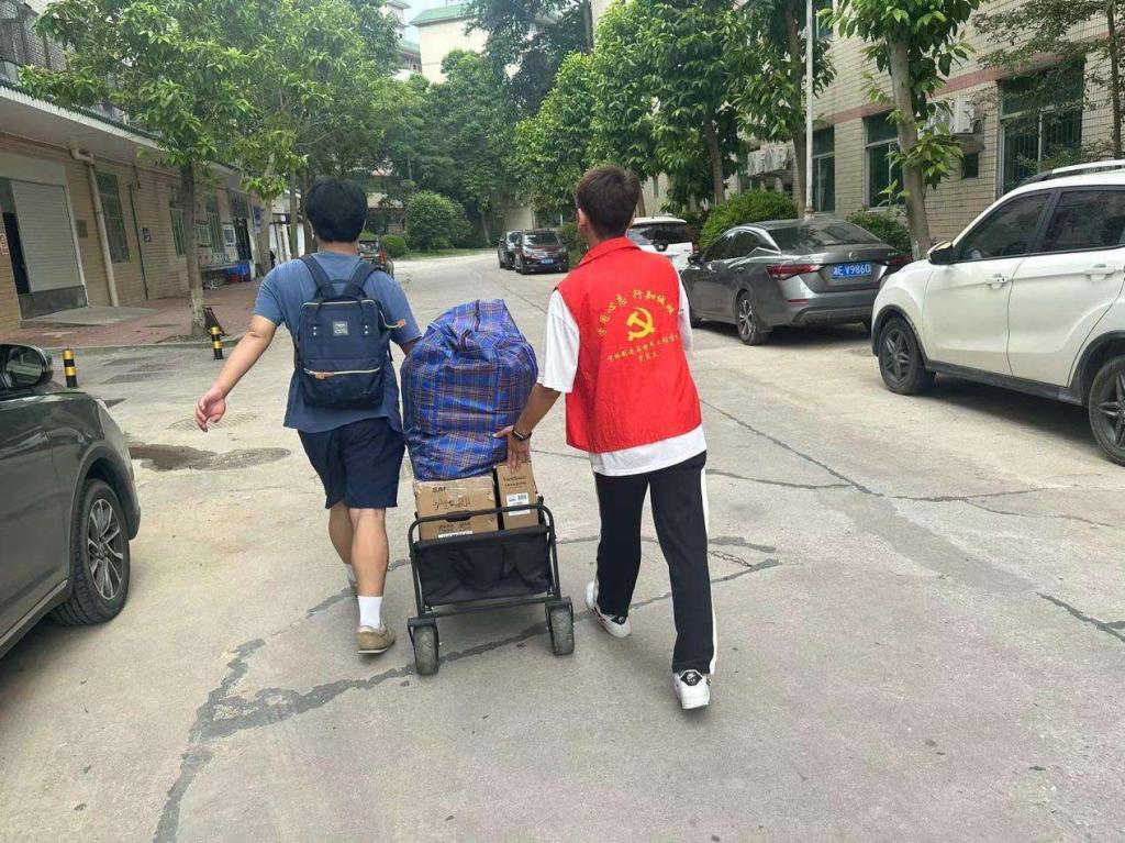 与此同时,一群身着统一服装的志愿者成为校园里最忙碌的身影。他们穿梭于人群之中,主动上前帮助同学们搬运行李,无论是沉重的行李箱还是琐碎的生活用品,都在他们的协助下轻松送达宿舍。