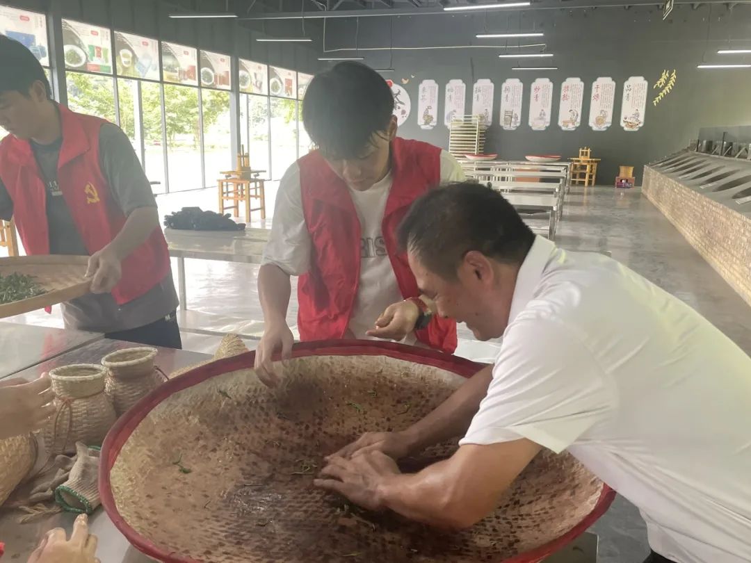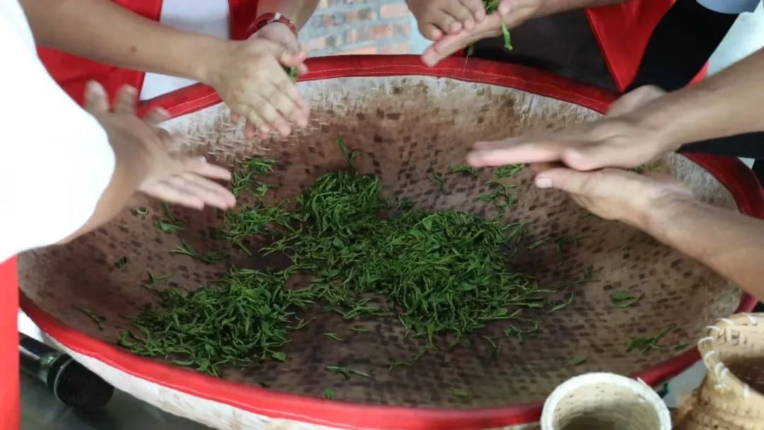 炒青完成后,茶叶进入揉捻阶段。揉捻是使茶叶揉卷成条、破坏叶细胞、挤出茶汁、黏附于叶表、增加茶叶浓度的重要步骤。我们站在一旁,观察厂长如何运用双手的力量,将茶叶揉成紧致的条状。随后,我们也纷纷尝试,虽然手法略显生疏,但每一次的按压与翻转都凝聚了我们对茶叶的期待。在揉捻的过程中,茶叶逐渐变得柔软而有弹性,散发出香气。在这个过程中,我们感受到了茶叶从松散到紧致的奇妙变化。