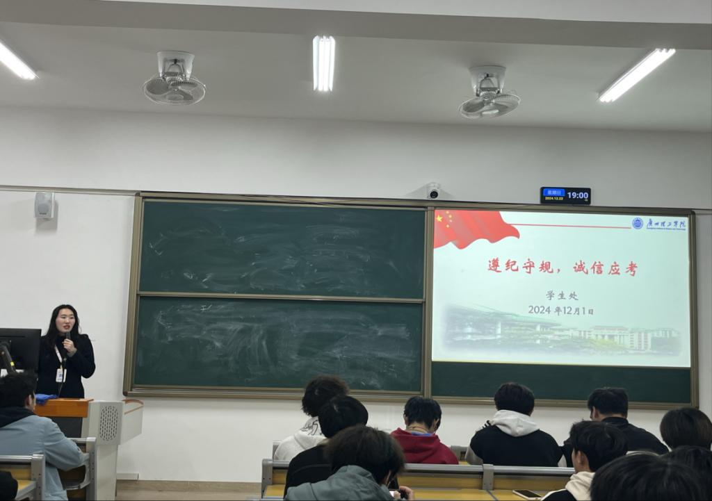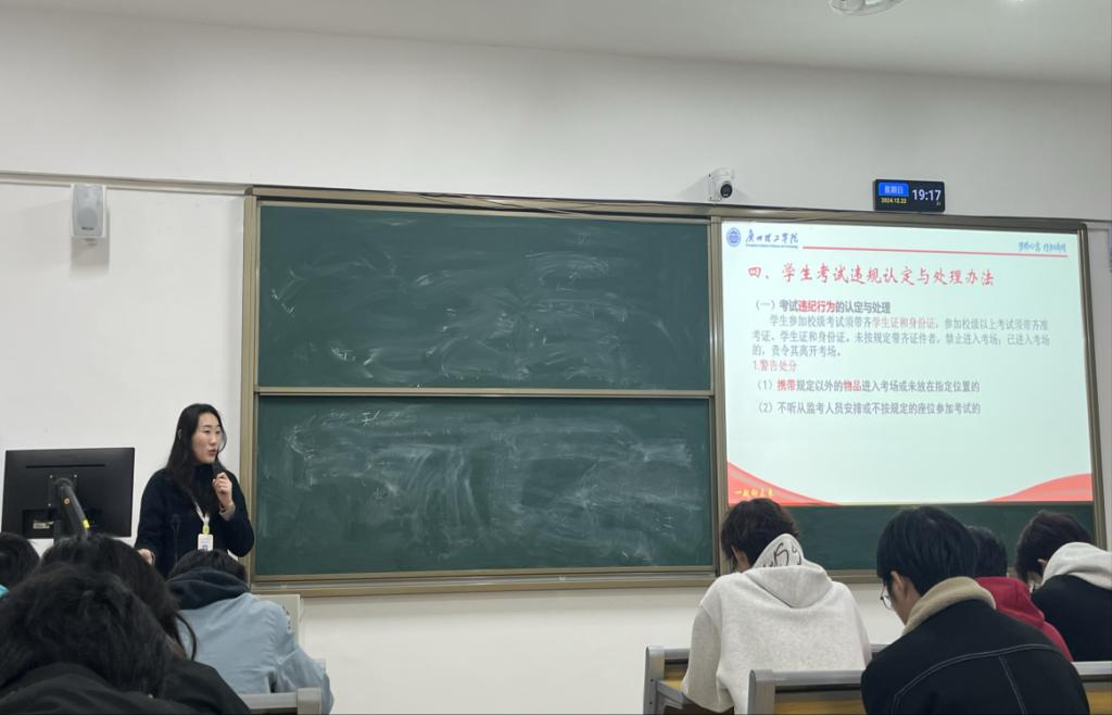 为进一步落实立德树人的根本任务,加强我院诚信考试教育,营造风清气正的考试环境,12月22日晚KY开元集团全体2024级同学在惠州校区教学楼召开“遵纪守规,诚信应考”主题班会,班会由助班老师主讲,组织学习诚信考试的相关知识,增强学生们的诚信意识,使同学们了解到诚信应考的重要性。