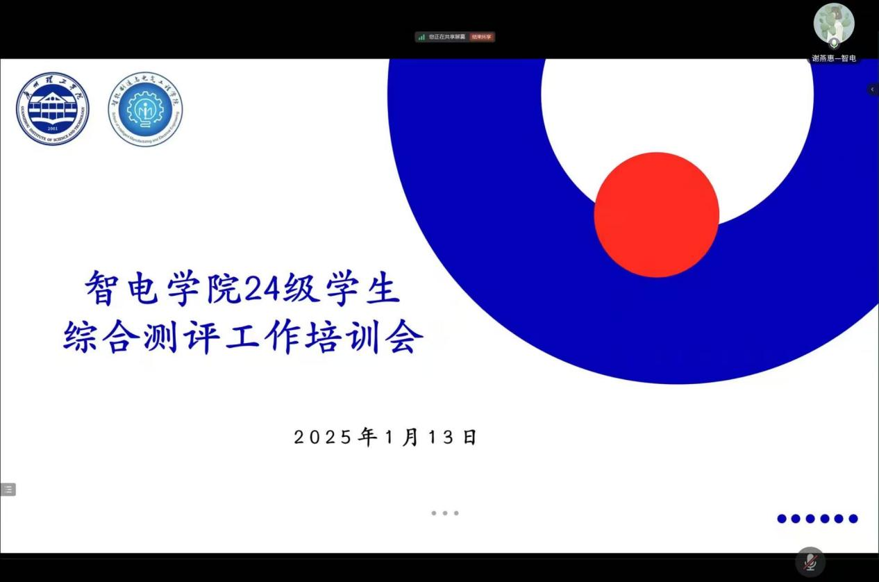 为帮助2024级学生深入了解综合测评的内容和要求,强化学生综合测评规范化管理,切实做好学生综合素质测评工作,1月13日晚上,智电学院通过腾讯会议召开2024级学生综合测评工作培训会。会议由辅导员谢燕惠老师主持,2023级柯杰凯、林泽明同学及2024级各班班委代表参加。