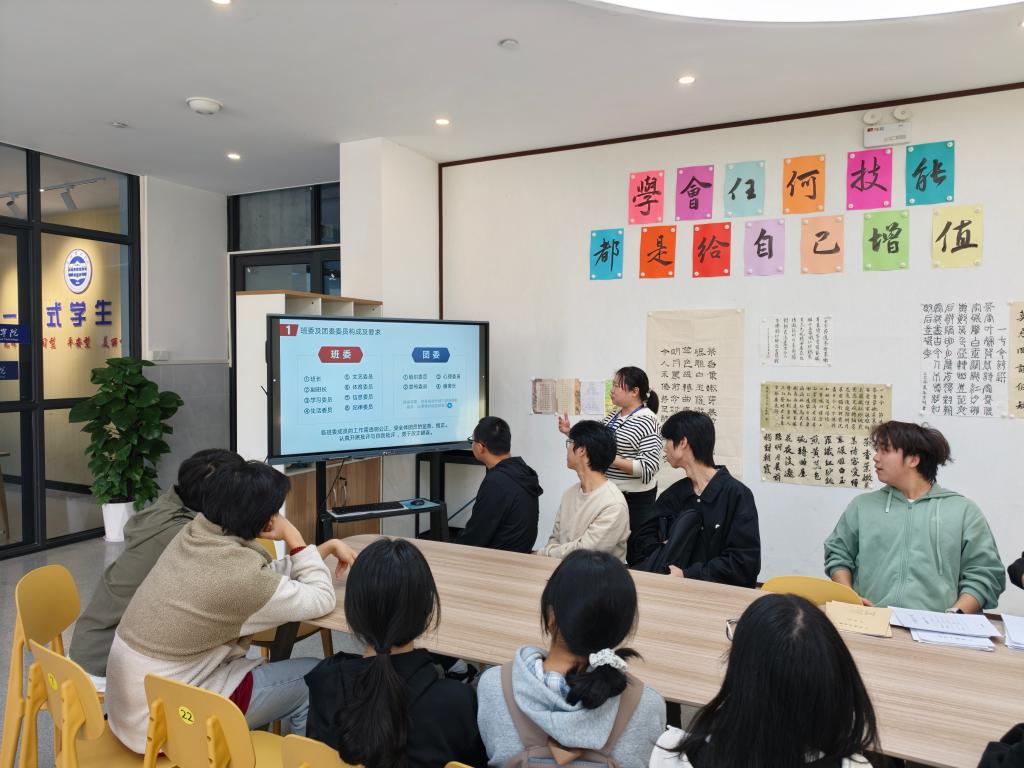 活动中,肖静园老师介绍了班委及团委委员的基本构成,并强调班委成员应做到工作透明公正、勇于自我批评、严于律己并发挥模范带头作用。