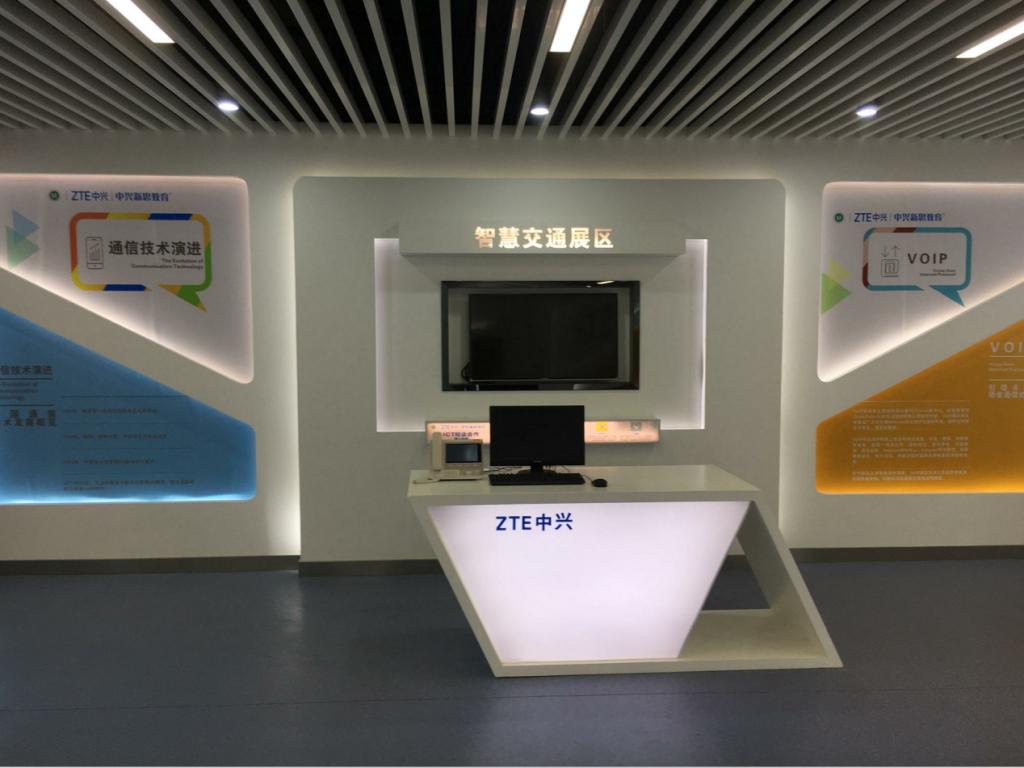 ICT展厅里中能看到中兴通讯目前所掌握的最前沿的光传输产品,4G通信产品、基础产品等等。这4个显示屏分别对应4G-LTE基础通信、数据通信、PTN光传输、XPON光接入、现代交换等技术,采用了视频与中兴通讯目前最先进的设备详解后,且与电信运营商现网运行设备完全一致的设备进行介绍和展示。ICT展厅与前面介绍的实验室一起旨在打造一个与现网完全一致的真实环境,起到教学和科研两方面作用:教学方面采用“理实结合方式”让我们的学生在一个与现网完全一致的设备环境中学习、实践,未来到工作岗位后在技术技能方面实现无缝对接。
