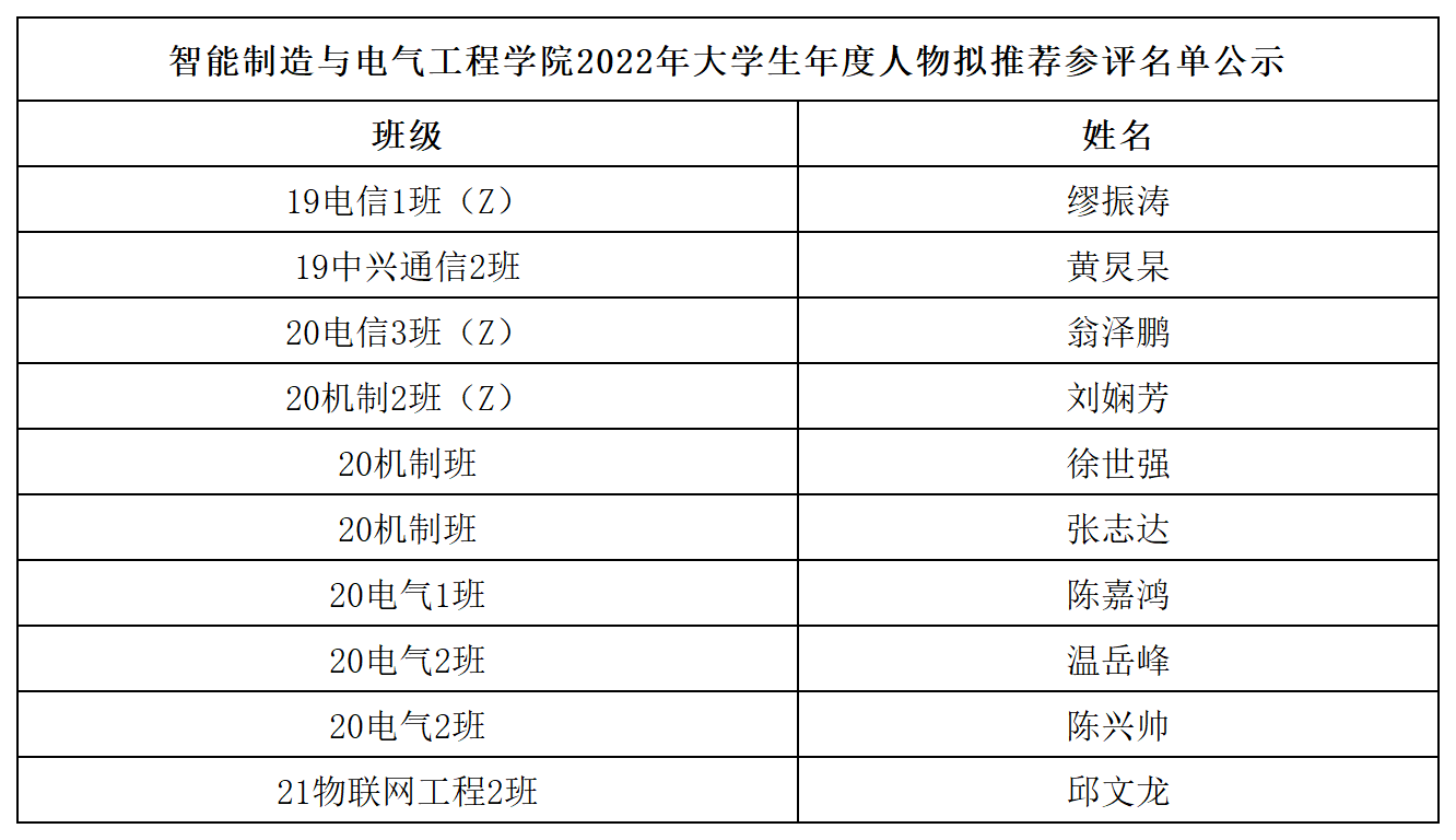 根据《关于开展2022年广州理工学院大学生年度人物评选活动的通知》文件要求,经个人申报、学院初审,学院拟推荐10名同学参加学校2022年大学生年度人物评选,此名单于2022年3月7日至2023年3月9日进行公示,如有异议,请于2023年3月9日前向老师反映:石老师;办公地点:工程楼201。