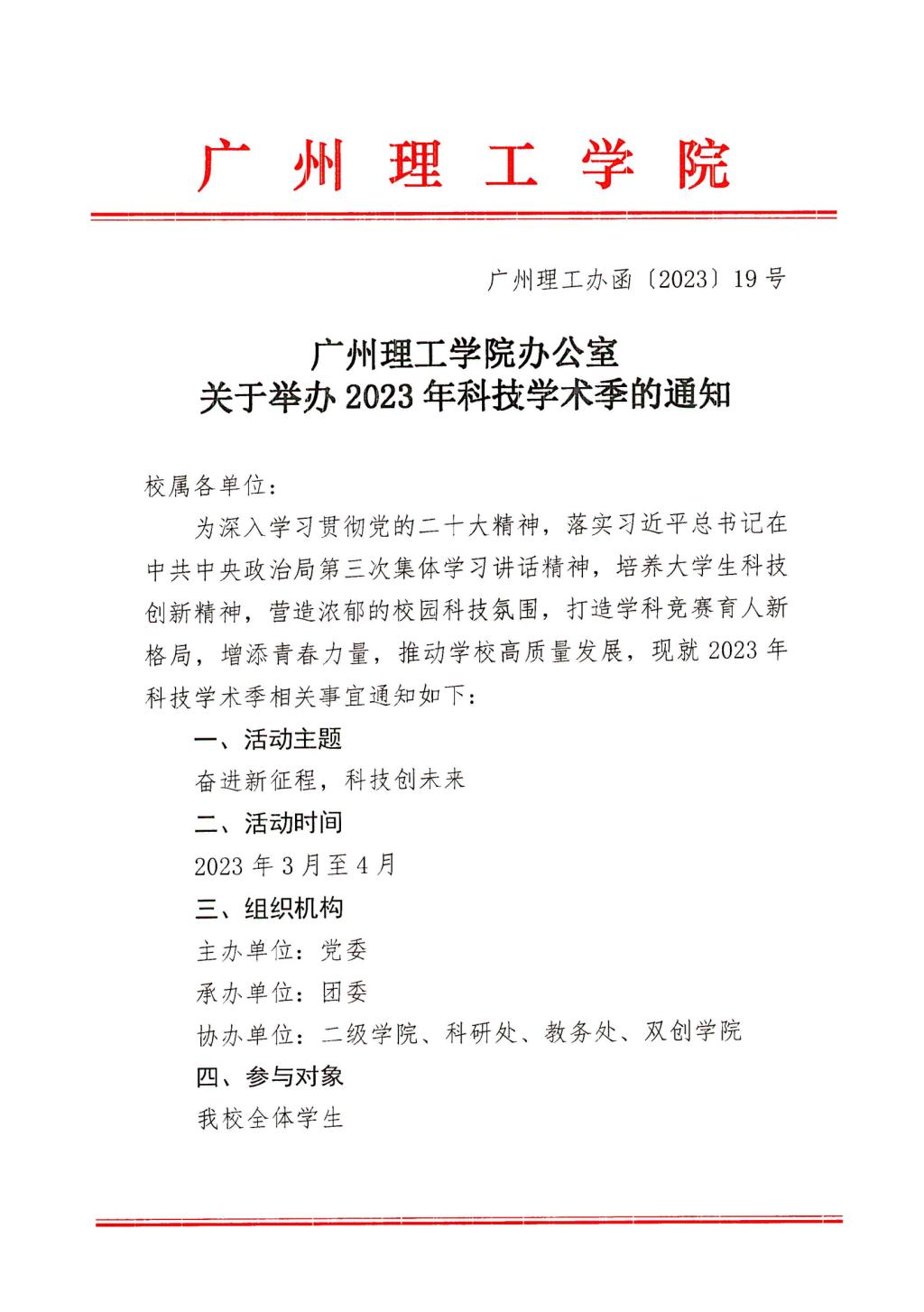 为深入学习贯彻党的二十大精神,落实习近平总书记在中共中央政治局第三次集体学习讲话精神,培养大学生科技创新精神,营造浓郁的校园科技氛围,打造学科竞赛育人新格局,增添青春力量,推动学校高质量发展,现就 2023年科技学术季相关事宜通知如下: