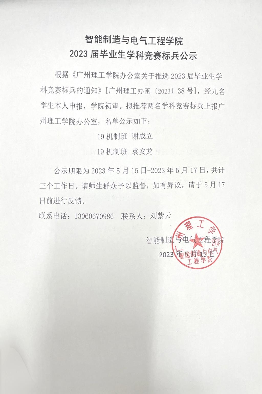 根据《广州理工学院办公室关于推选2023届毕业生学科竞赛标兵的通知》[广州理工办函〔2023〕38号],经九名学生本人申报,学院初审。拟推荐两名学科竞赛标兵上报广州理工学院办公室,名单公示如下。公示期限为2023年5月15日-2023年5月17日,共计三个工作日。请师生群众予以监督,如有异议,请于5月17日前进行反馈。