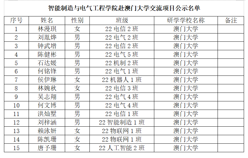 根据《广州理工学院学生处关于选派优秀学生赴澳门大学短期研习的通知》,经前期学生自愿报名,学院审核把关,拟推荐林漫琪等15位同学赴澳门大学开展学术交流活动,拟派出学生名单如下,公示期为2023年10月20日至2023年10月24日。期间若对该名单有异议,请在公示期间内向智电学院办公室反映。反映情况时请签署真实姓名和联系电话,有具体事实;不签署真实姓名或不提供具体事实材料的,将不予受理。