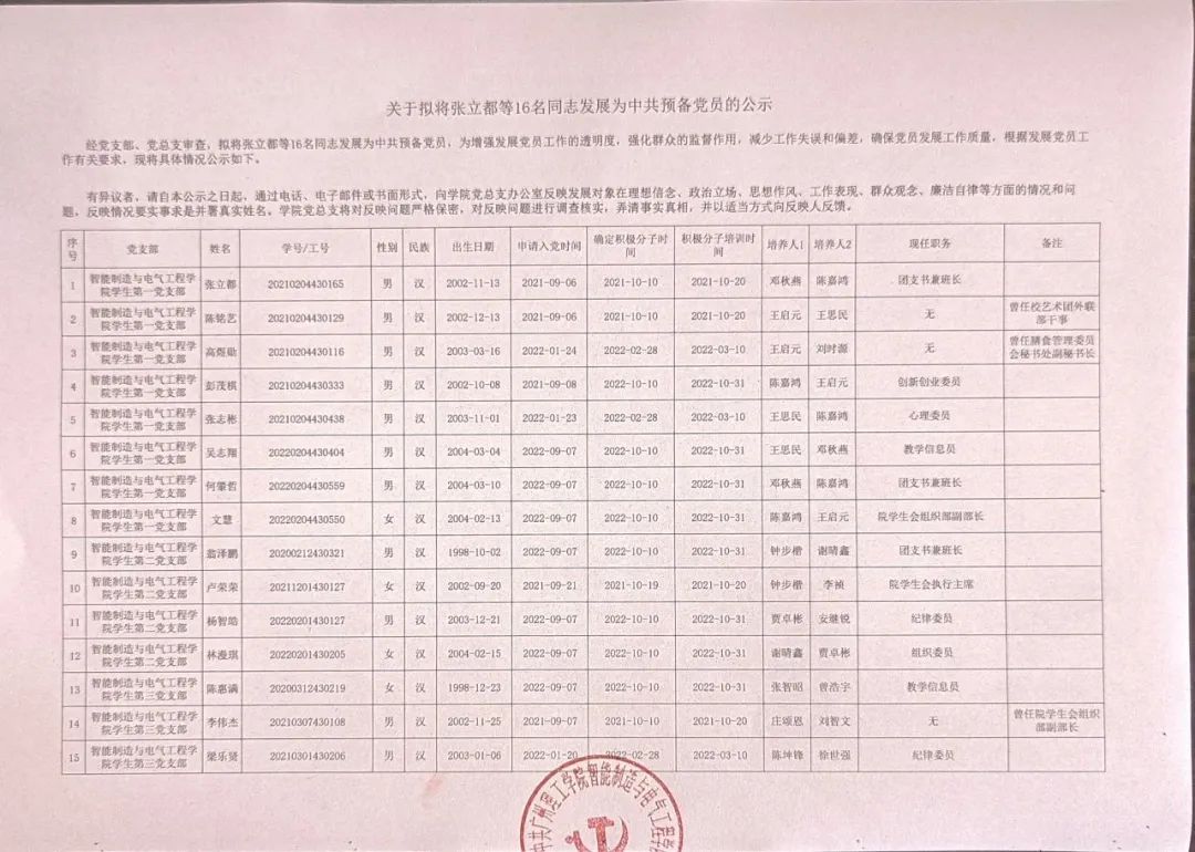 经党支部、党总支审查,拟将张立都等16名同志发展为中共预备党员,为增强发展党员工作的透明度,强化群众的监督作用,减少工作失误和偏差,确保党员发展工作质量,根据发展党员工作有关要求,现将具体情况公示如下。