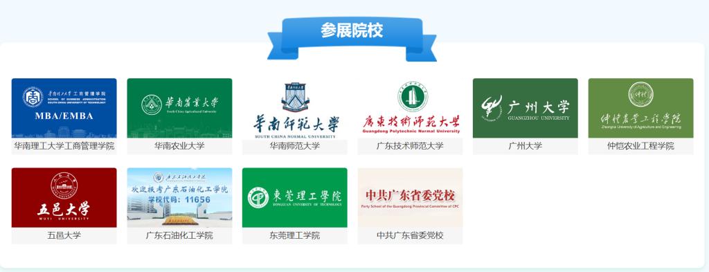 参展院校名单(持续更新中):华南理工大学、华南农业大学、华南师范大学、广东技术师范大学、广州大学、仲恺农业工程学院、五邑大学、广东石油化工学院、东莞理工学院、中共广东省委党校......