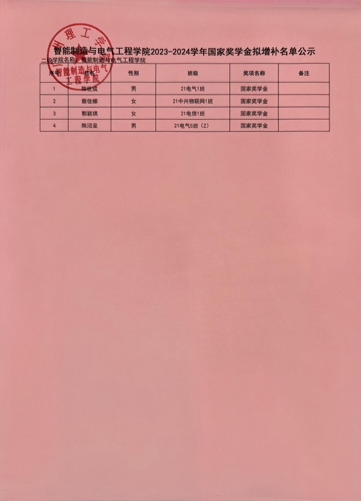 根据《2023-2024学年奖学金评比工作方案》(广州理工学函〔2024〕148号)及上级相关文件要求,我院开展国家奖学金增补工作。经学生本人提出申请、二级学院严格评选,现将获得2023-2024学年国家奖学金增补的陈世成等4位同学名单予以公示。