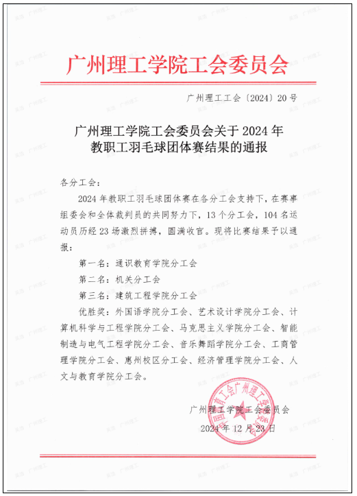 广州理工学院工会委员会关于2024年教职工羽毛球团体赛结果的通报